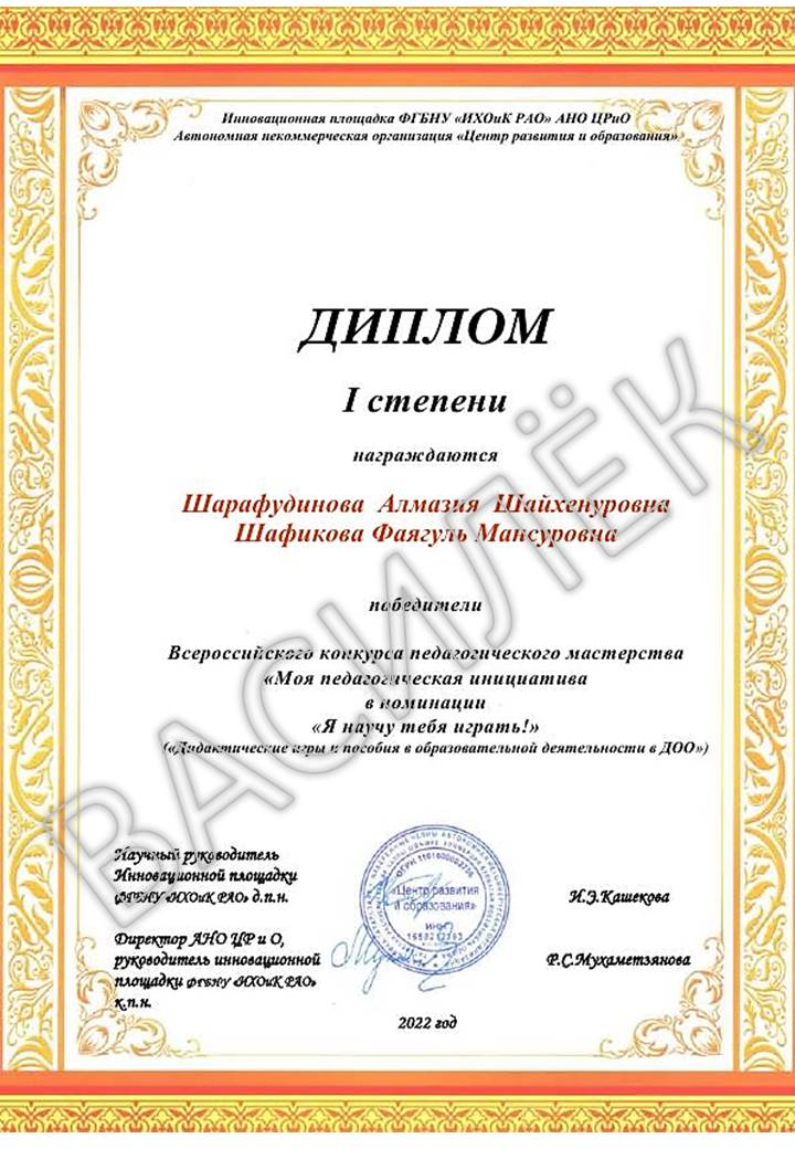 Шарафутдинова Алмазия Шайхенуровна, Шафикова Фаягуль Мансуровна, диплом I степени Всероссийского конкурса педагогического мастерства "Моя педагогическая инициатива" в номинации "Я научу тебя играть!", 2022