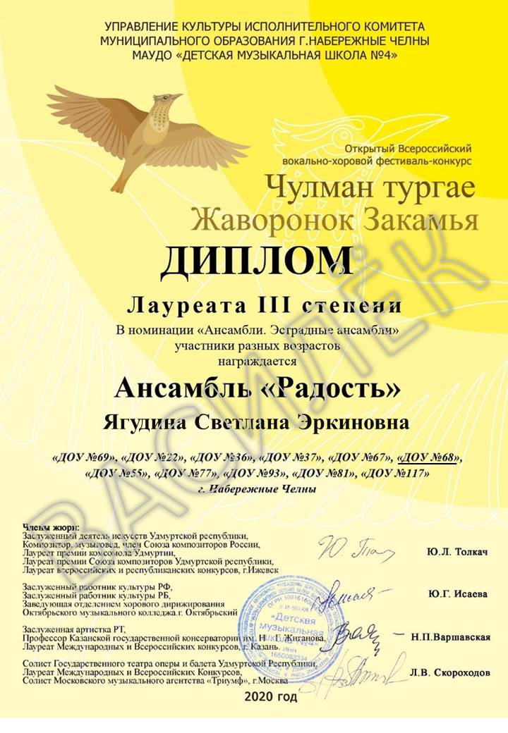 Ягудина Светлана Эркиновна, диплом Лауреата III степени Открытого Всероссийского вокально-хорового конкурса "Жаворонок Закамья", 2020