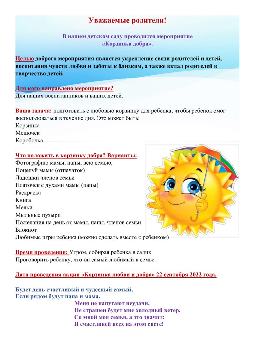 УВАЖАЕМЫЕ РОДИТЕЛИ, ПРИГЛАШАЕМ ВАС ПРИСОЕДИНИТСЯ К ГОРОДСКОЙ АКЦИИ "КОРЗИНКА ДОБРА" И ПРИНЯТЬ АКТИВНОЕ УЧАСТИЕ В ДЕТСАДОВСКОЙ АКЦИИ "КОРЗИНКА ДОБРА И РАДОСТИ"