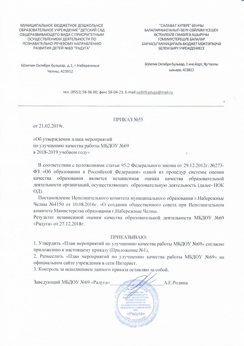 Приказ "Об утверждении плана мероприятий по улучшению качества работы МБДОУ №69 на 2019 год"