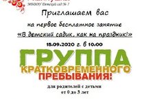 Приглашаем Вас на первое бесплатное занятие от 0 до 3 лет "В садик, как на праздник!" 18.09.2020 года в 10.00 часов