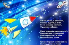 12 апреля наша страна отмечает День Космонавтики. Мы помним эту дату и гордимся, что именно наш, русский человек, покорил просторы космоса. Дети посмотрели видеофильм «Первые животные, побывавшие на космосе». После познавательной беседы, дети разгадывали загадки на космическую тему, с удовольствием провели физическую тренировку, которая необходима для будущих космонавтов, изготовили аппликацию «Космическая ракета». Для детей проведена игра «Полет в космос». Во время старта наших ракет все ребята радостно закричали слова первого космонавта Ю. А. Гагарина «П-о-е-х-а-л-и!!!». Дети получили много знаний и положительных эмоций. Космическое путешествие удалось на славу!