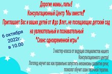 Уважаемые родители! Консультационный Центр "Мы вместе!" приглашает вас с детьми на увлекательный мастер-класс от наших партнеров Детской школы театрального искусства, который состоится 26.10.2022г. в 10.00. Мы всегда рады видеть вас в нашем детском саду!