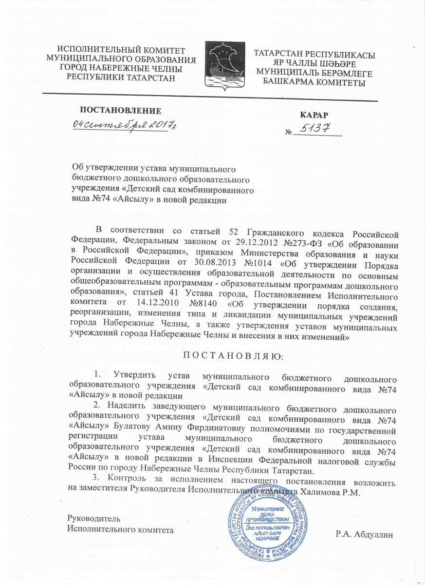 Постановление Исполнительного комитета муниципального образования город Набережные Челны Республики Татарстан от 04.09.2017 г. № 5137 "Об утверждении устава муниципального бюджетного дошкольного образоватедльного учреждения " Детский сад комбинированного вида №74 "Айсылу"