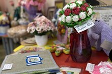 Ко Дню матери в холле детского сада организована выставка творческих работ "Моя мама рукодельница".