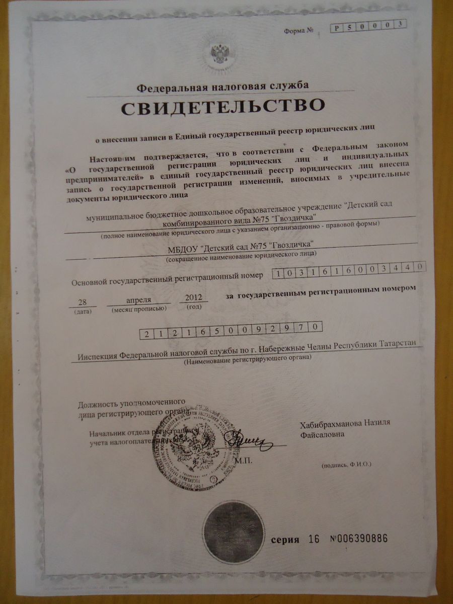 Копия свидетельства о внесении записи в ЕГРЮЛ