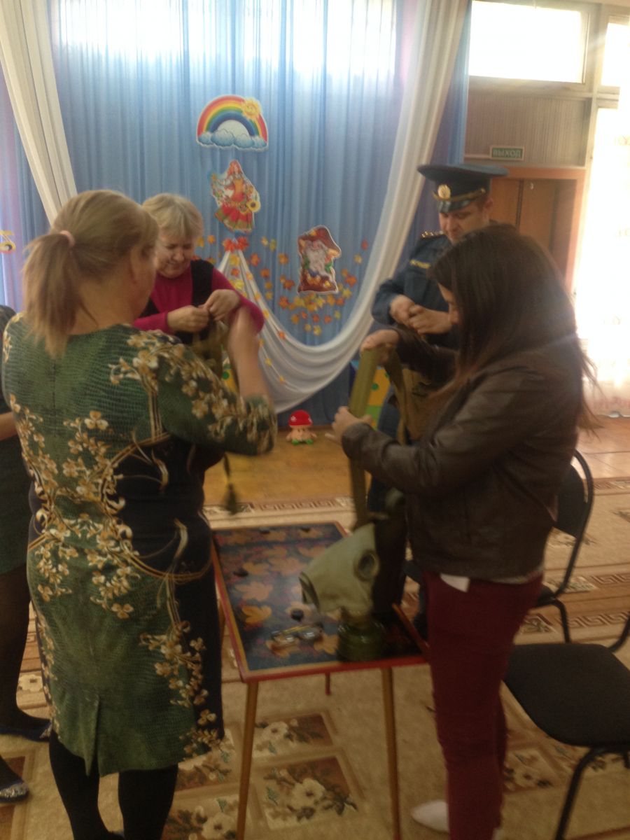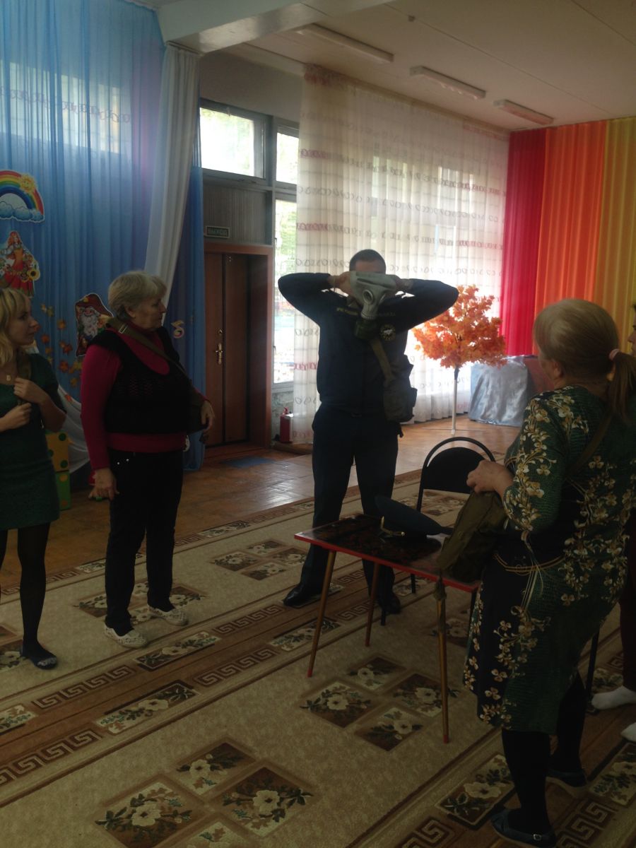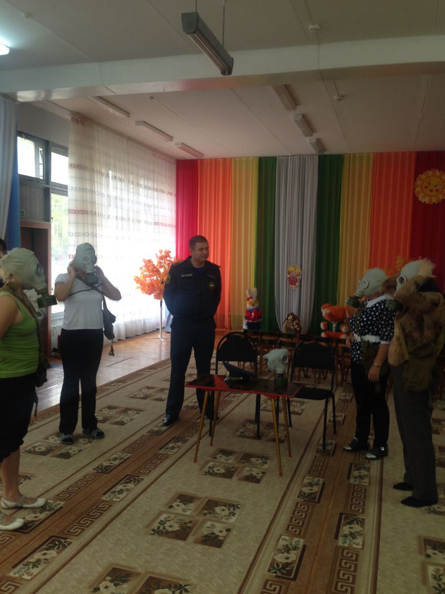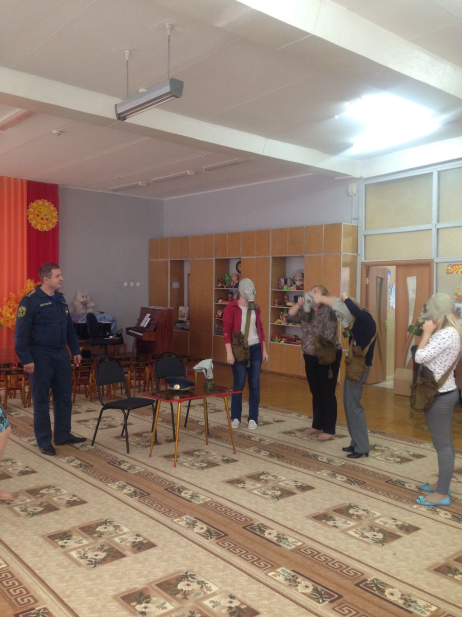 В детском саду прошло обучение персонала и воспитанников в области гражданской обороны и защиты от чрезвычайных ситуаций. В рамках данного обучения педагоги и дети ознакомились с инструкцией по эксплуатации противогаза, тренировались правильно надевать противогаз на время по команде «Газы»