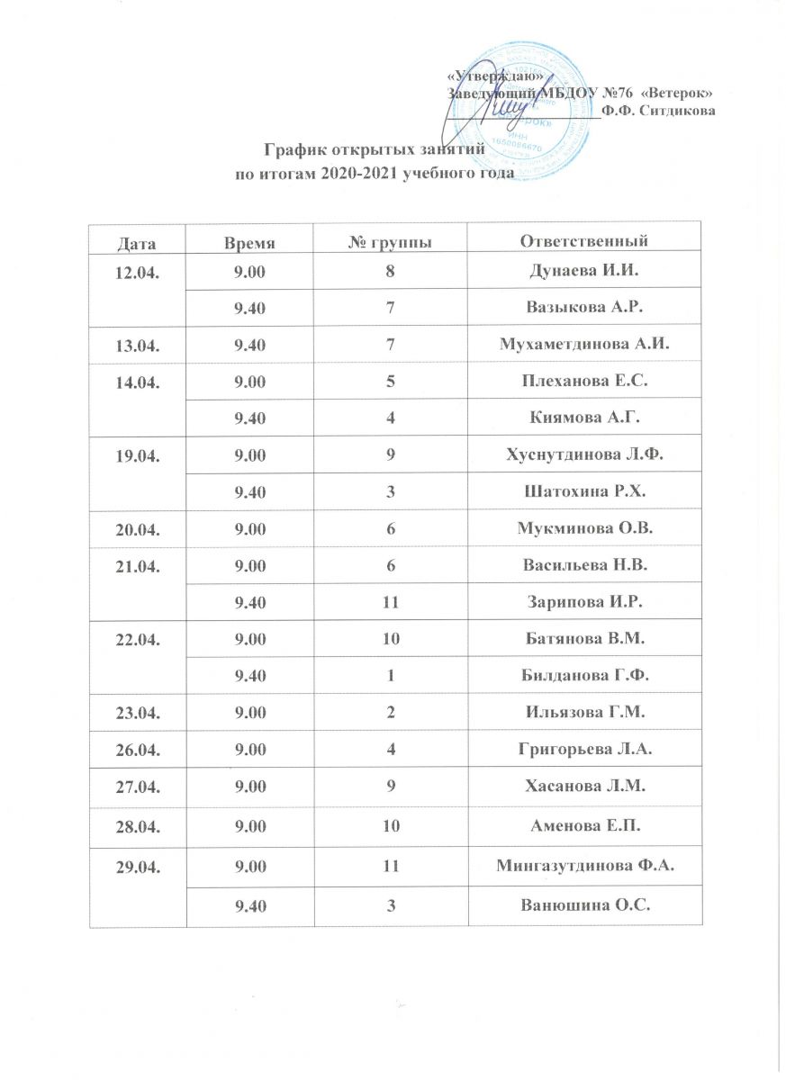 График открытых занятий по итогам 2020-2021 учебного года 07.04.2021