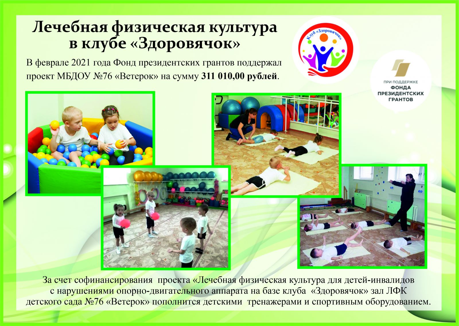 21.11.2022 В 2021-2022 г. на базе ДОУ №76 реализован федеральный проект на тему «Лечебная физическая культура для детей-инвалидов с НОДА на базе клуба «Здоровячок». Благодаря поддержке гранта Президента Российской Федерации зал ЛФК оснащен тренажерами и специализированным оборудованием.Воспитанники прошли курс авторских занятий по адаптивной и ЛФК на базе клуба «Здоровячок». Однако, первого направления работы клуба было недостаточно, поэтому в клубе «Здоровячок» организовано второе направление работы - коррекционно-педагогические занятия. (фотографии)