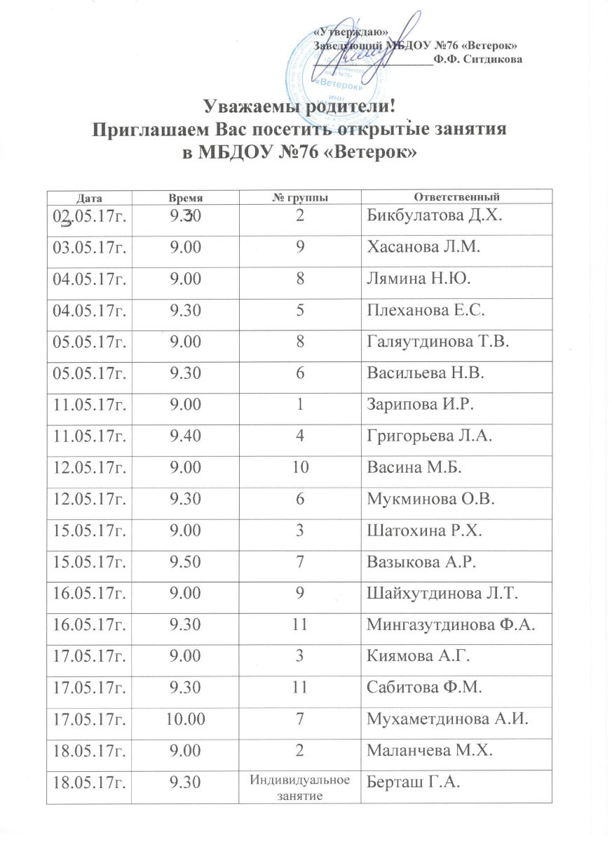 Опубликовано: 28.04.2017Полный график проведения занятий см. здесь. При выборе ориентируйтесь на № группы и фамилию воспитателя