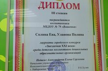7 декабря 2023 года завершился гала-концертом муниципальный конкурс «Звездочки XXI века» среди детских коллективов дошкольных образовательных учреждений города Набережные Челны. Данное мероприятие ежегодно проводится в целях выявления юных талантов, раскрытия музыкальных способностей детей дошкольного возраста, привлечения внимания педагогов дошкольных образовательных учреждений и детей к вопросам развития культуры и сохранения культурно-исторического наследия народов Республики Татарстан, эстетического воспитания. Наши девочки с подготовительной группы №8 Уланова Полина и Солина Ева выступили на этом конкурсе с вокальным номером "Воспитатели" и заняли почетное третье место! С большой радостью поздравляем наших девочек и музыкального руководителя Александрову Елену Сергеевну с достойной победой!Желаем и в дальнейшем успешного покорения любых вершин и достижения поставленных целей!