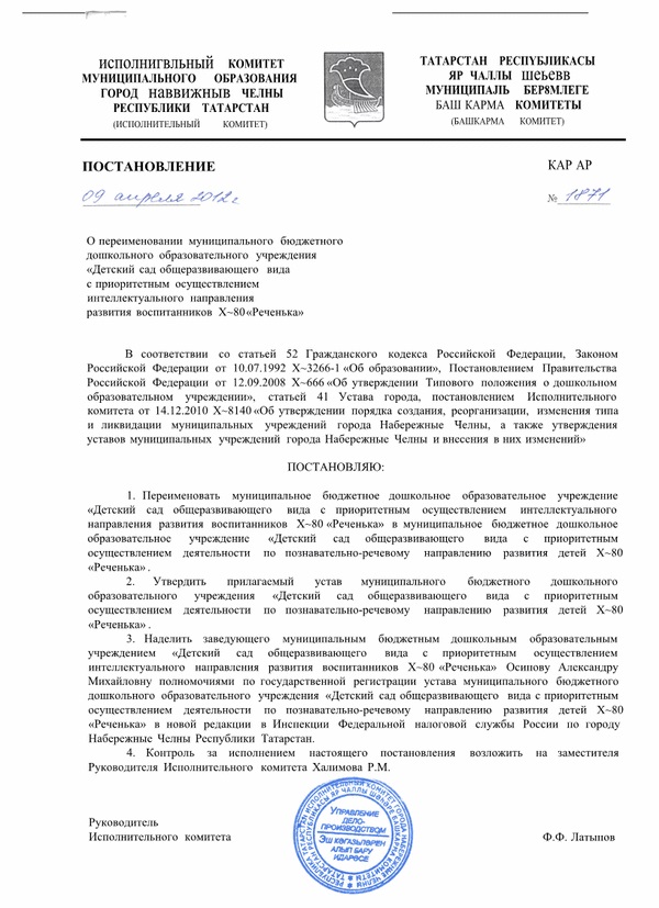 Муниципальное бюджетное дошкольное образовательное учреждение «Детский сад общеразвивающего вида с приоритетным осуществлением деятельности по познавательно-речевому направлению развития детей №80 «Реченька» / «Инешкәй» 80 нче балаларның танып-белү-сөйләм үсешен өстенлекле гамәлгә ашыручы гомүм үстерешле балалар бакчасы» муниципаль бюджет мәктәпкәчә белем бирү учреждениесе.