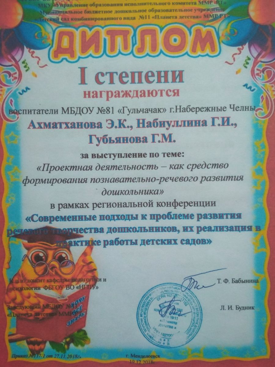 Опубликовано: 20.12.2018Наши педагоги приняли участие в региональной конференции, которая прошла в г. Менделеевск. Тема конференции: "Современные подходы к проблеме развития речевого творчества дошкольников, их реализация в практике работы детских садов". Воспитатели 1 группы - Набиуллина Г.И., Губьянова Г.М. и учитель-логопед Ахматханова Э.К. опубликовали материал и выступили на тему "Проектная деятельность - как средство формирования познавательно-речевого развития дошкольника".