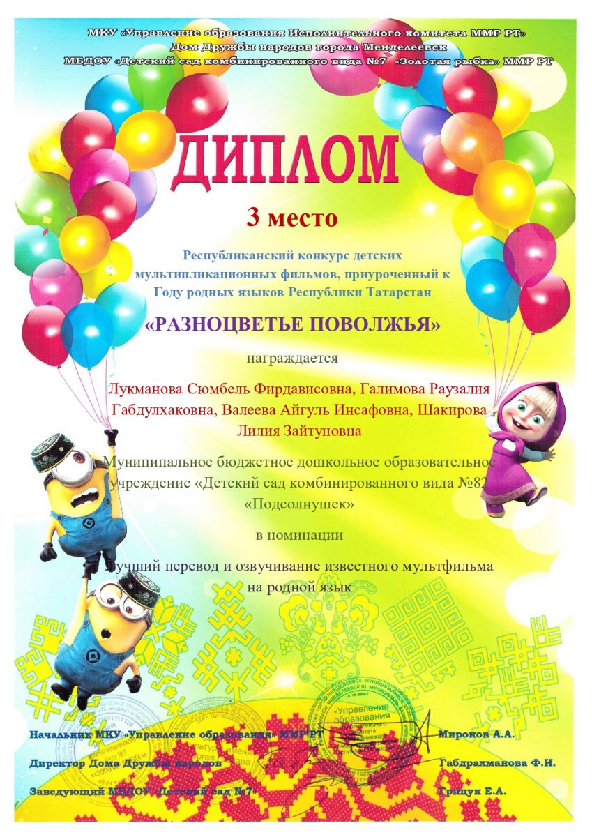 Бакчабызның иҗади төркеме, Татарстан Республикасында Туган телләр һәм халыклар бердәмлеге елы кысаларында үткәрелгән «РАЗНОЦВЕТЬЕ ПОВОЛЖЬЯ» республика конкурсының “Танылган мультфильмның иң яхшы тәрҗемәсе” номинациясендә катнашып 3нче урынга ия булдылар. Лукманова Сюмбель Фирдависовна, Галимова Раузалия Габдулхаковна, Валеева Айгуль Инсафовна, Шакирова Лилия Зайтуновна – сезне котлыйбыз!