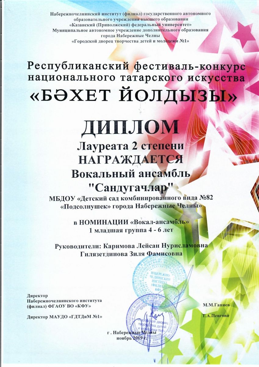Балалар бакчасының "Сандугачлар" вокал ансамбле "Бәхет йолдызы" республика бәйгесендә катнашып 2 дәрәҗә лауреат дипломына лаек булды.