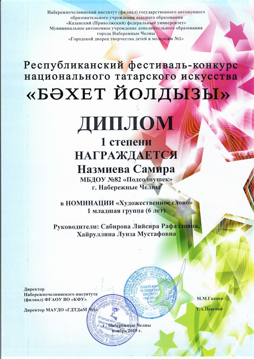 Безнең балалар бакчасында тәрбияләнүче Назмиева Самира "Бәхет йолдызы" республика бәйгесендә катнашып 1 дәрәҗә дипломгалаек булды.