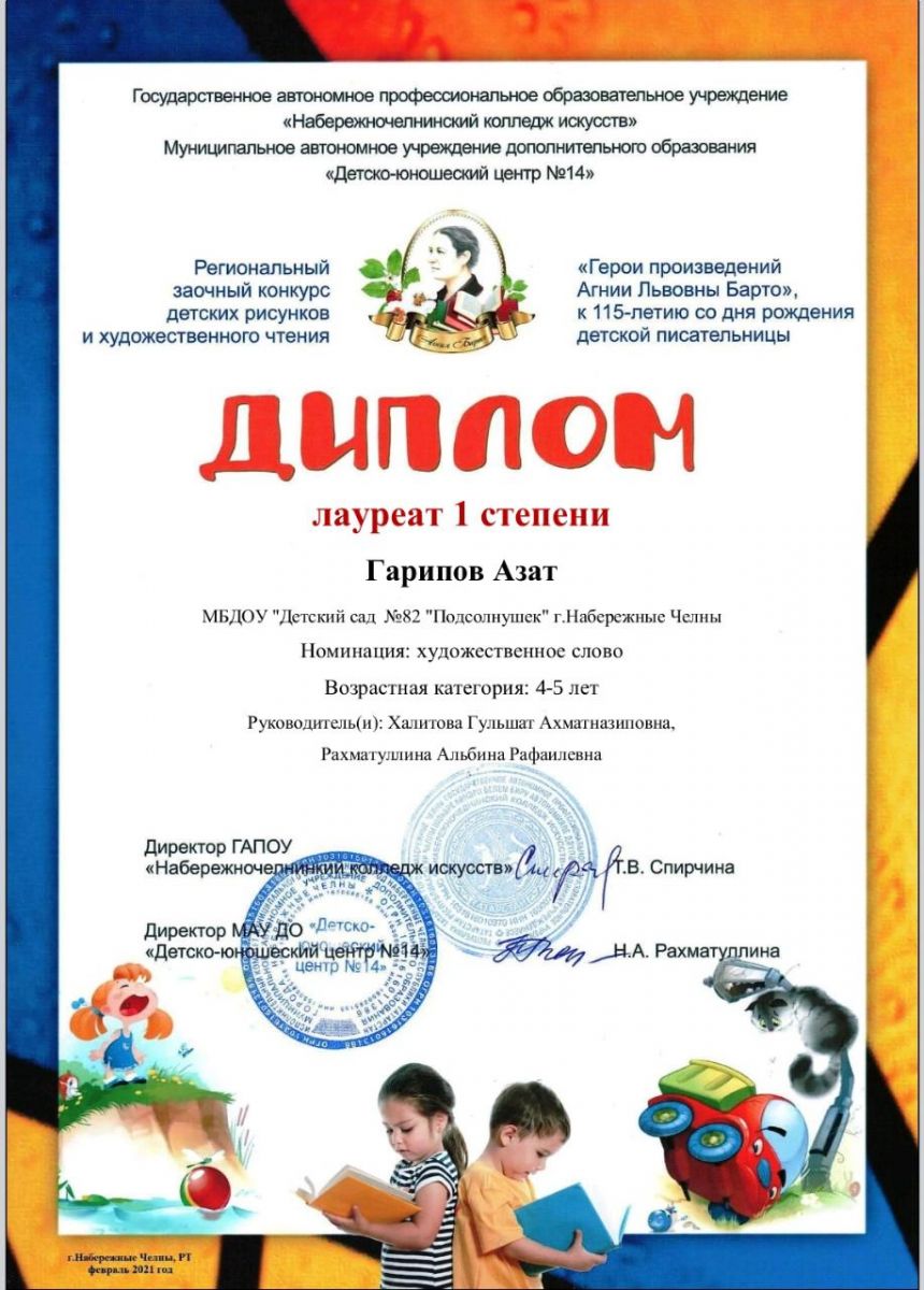 Региональный конкурс художественного чтения "Герои произведений А.Л.Барто", диплом первой степени
