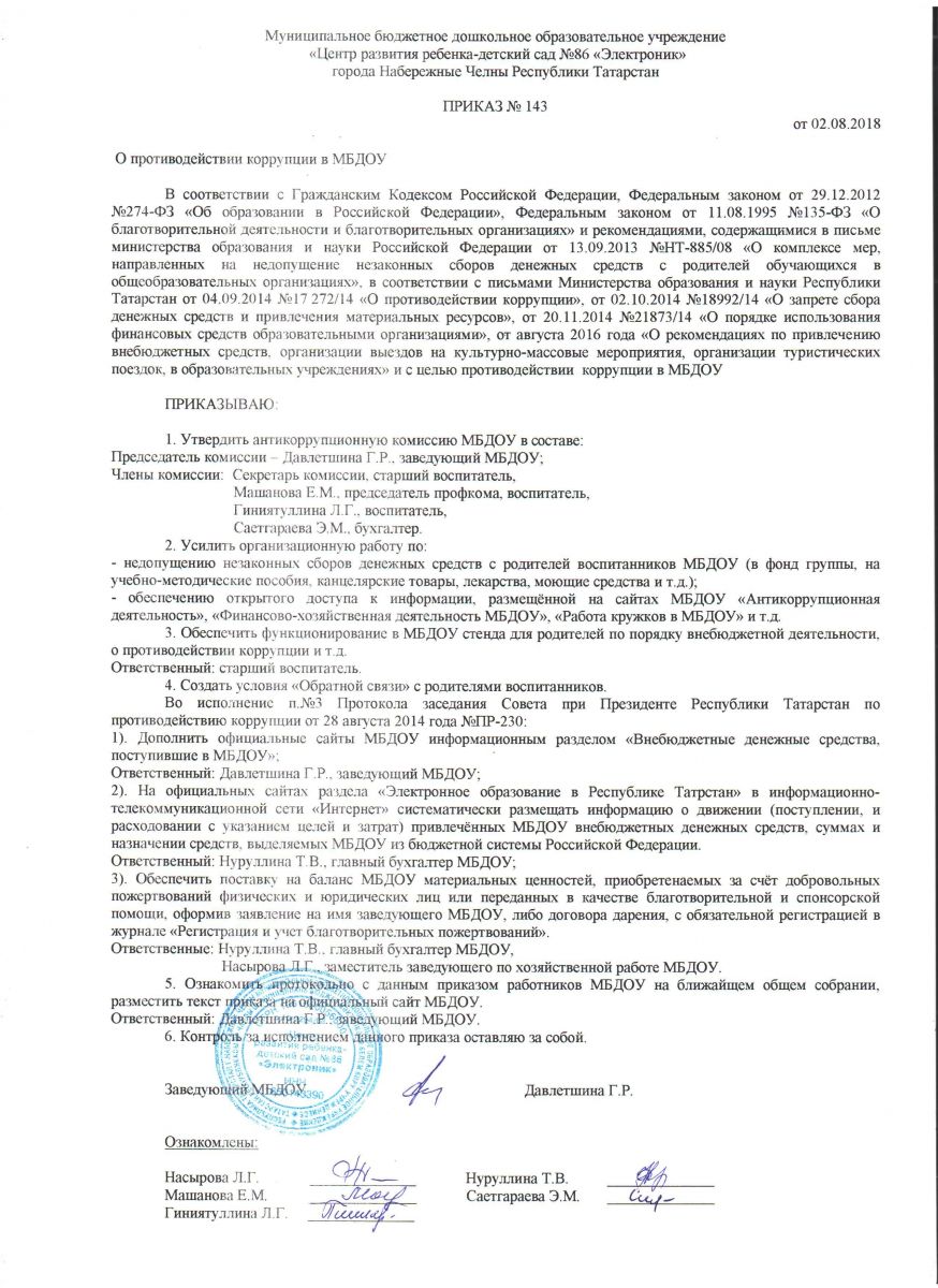 Приказ заведующей МБДОУ от 02 августа 2018 г. № 143  "О противодействии коррупции в МБДОУ"