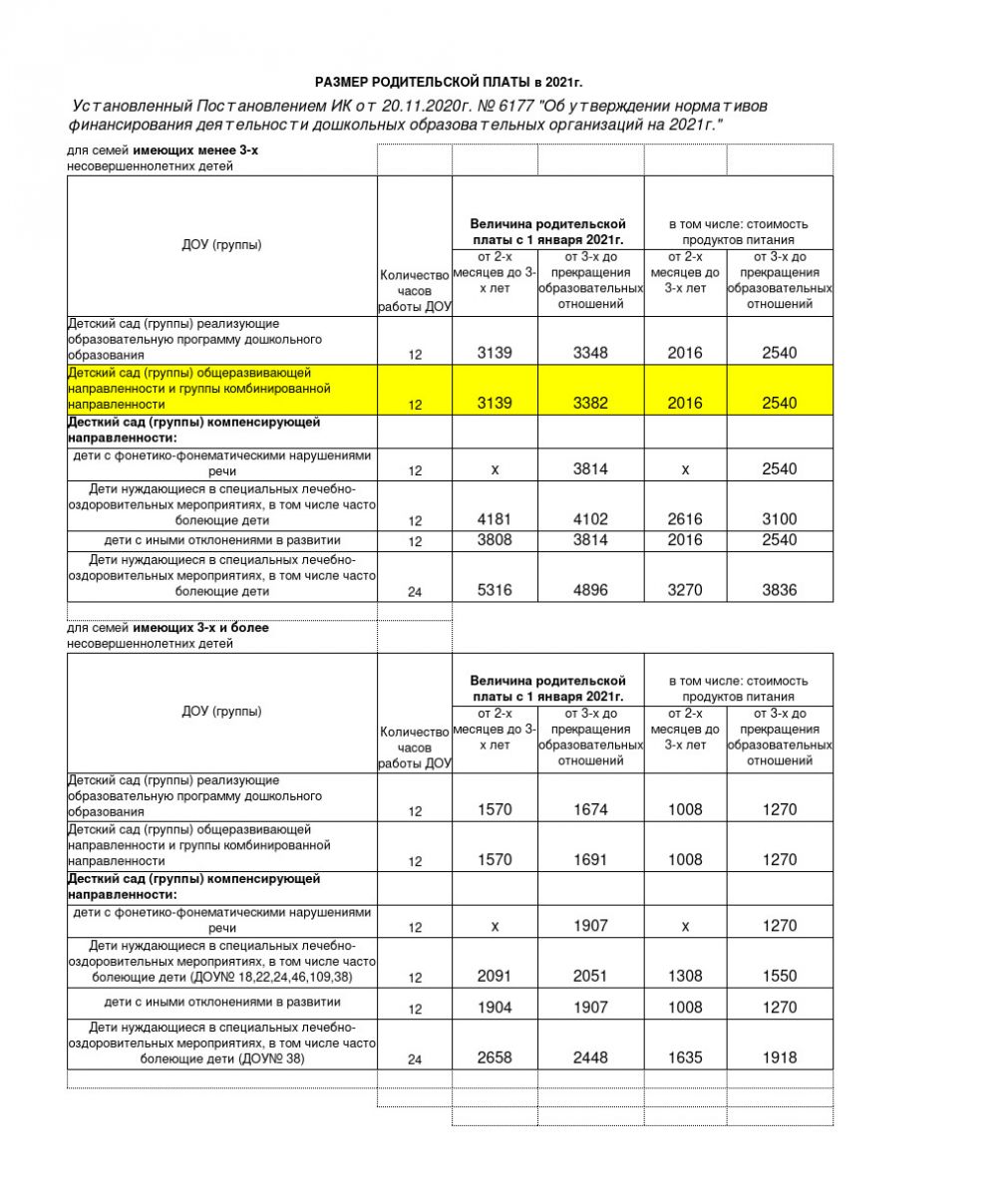 Уважаемые родители! Постановлением ИК от 20.11.2020 г. № 6177 "Об утверждении нормативов финансирования деятельности муниципальных образованых организаций, реализующих программы дошкольного образования муниципального образования город Набережные Челны на 2021 год" был утвержден размер родительской платы за детский сад с 01.01.2021 г. -