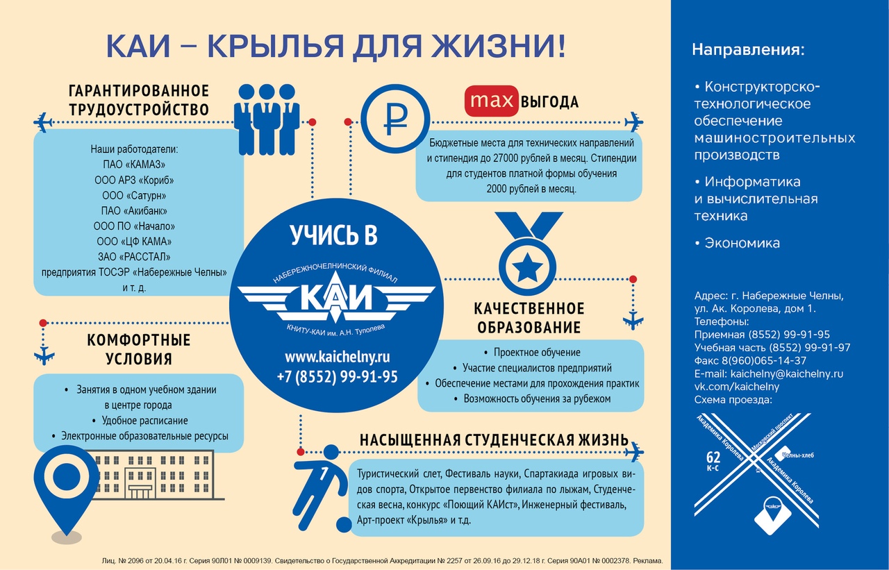 Набережночелнинский филиал федерального государственного бюджетного образовательного учреждения высшего образования «Казанский национальный исследовательский технический университет им. А.Н. Туполева-КАИ» предлагает Вам получить образование по трем направлениям подготовки: