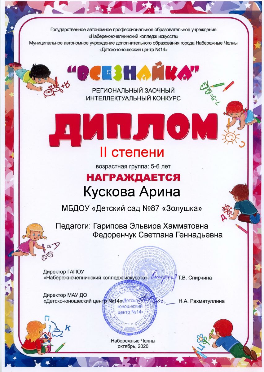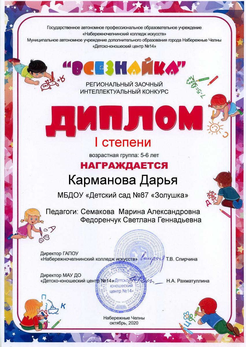 Опубликовано: 05.11.2020Воспитанники нашего детского сада приняли участие в региональном интеллектуальном конкурсе "Всезнайка" и заняли призовые места