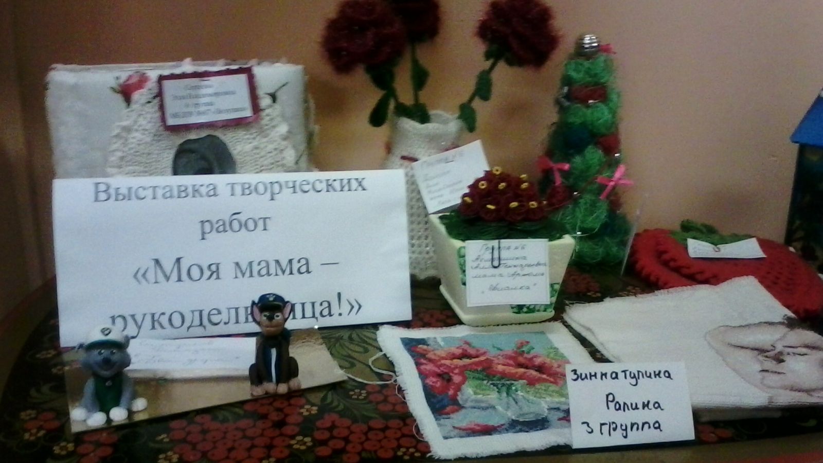 Опубликовано: 22.11.2016В ДОУ прошли мероприятия, посвящённые Дню матери. Была организована выставка работ, выполненных руками мамы.Чего только не было представлено нашему взору, и всё это сделано с любовью и лаской.