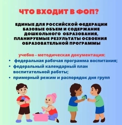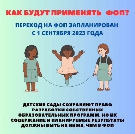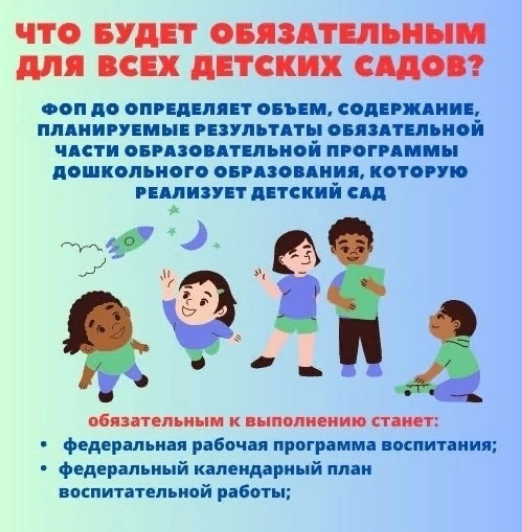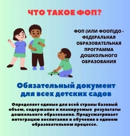 Опубликовано: 20.03.2023Уважаемые родители, информируем вас о том, что с сентября 2023 года все детские сады переходят на работу по новой Федеральной образовательной программе дошкольного образования. Минпросвещения приказом от 25.11 2022г. № 1028 утвердило новую ФОП ДО.