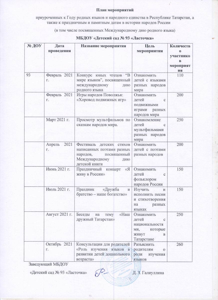 2021 год в Татарстане объявлен годом родных языков и народного единства. В связи с этим, в нашем детском саду разработан план мероприятий празднования данного события.