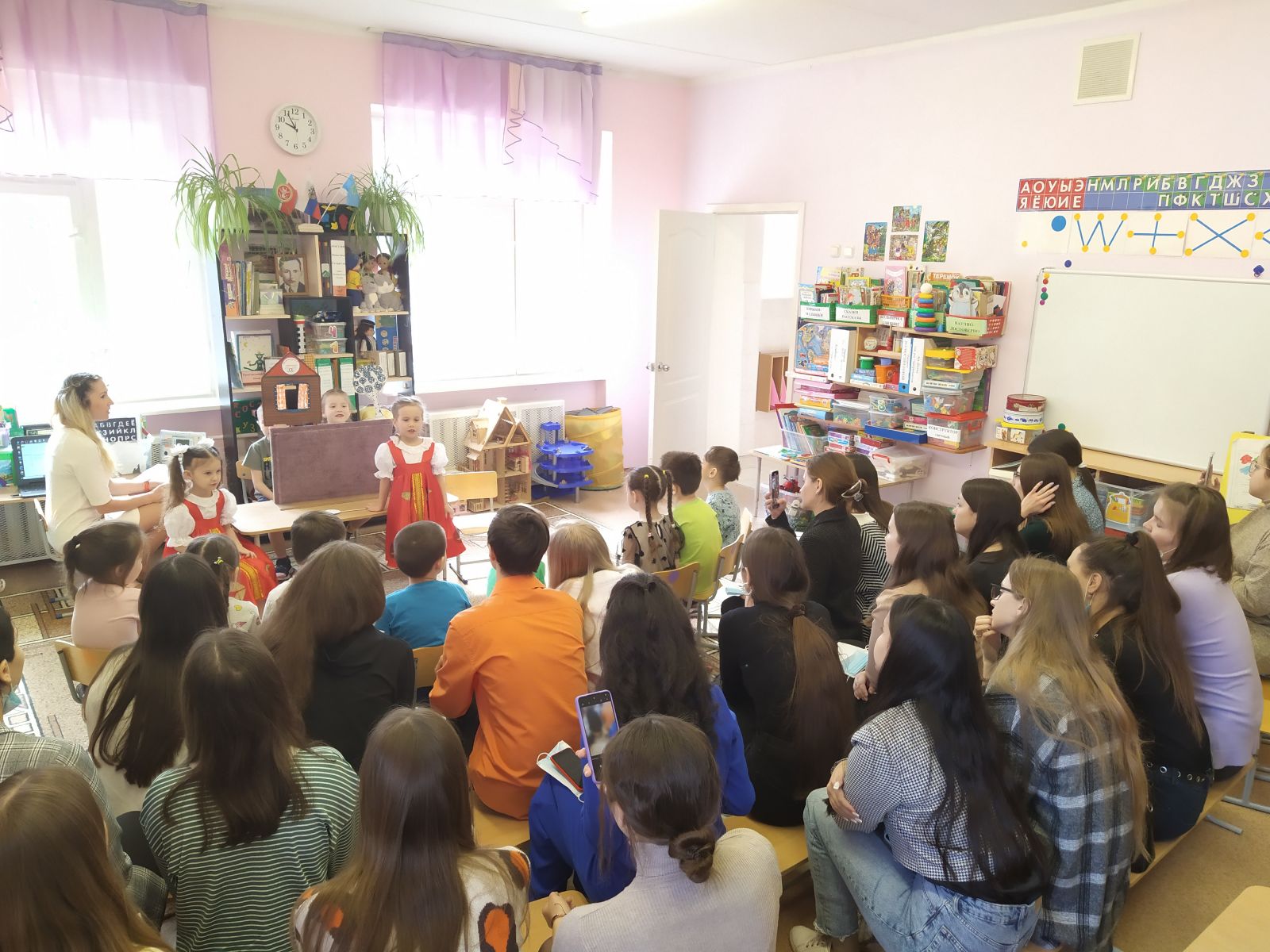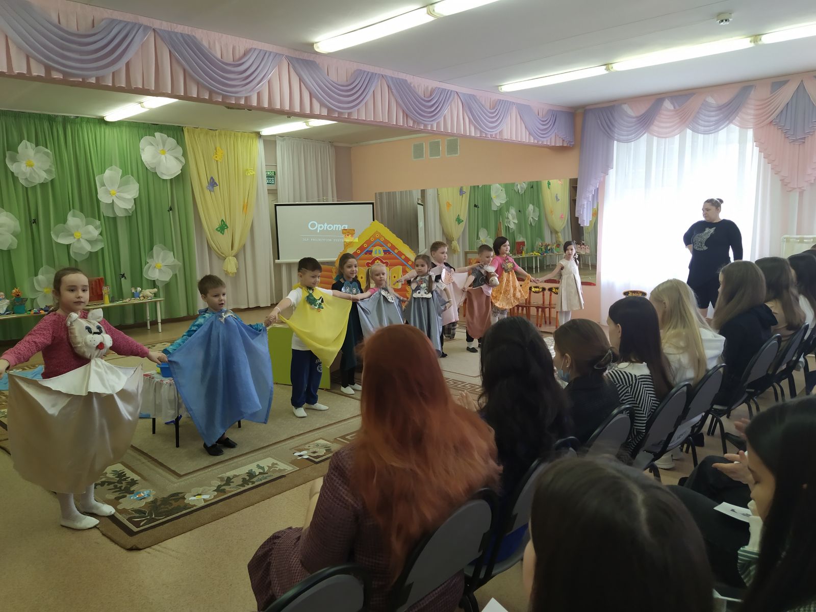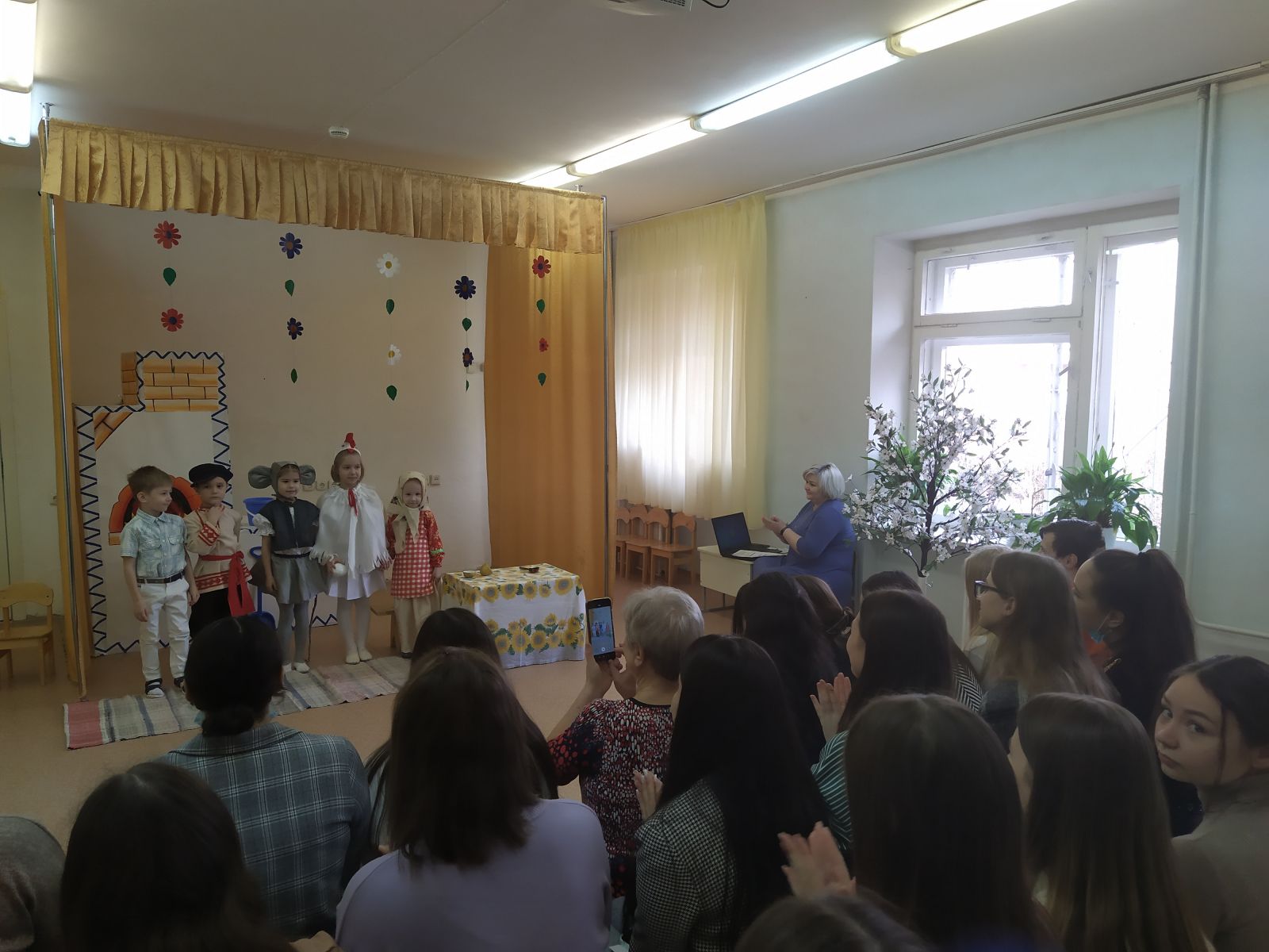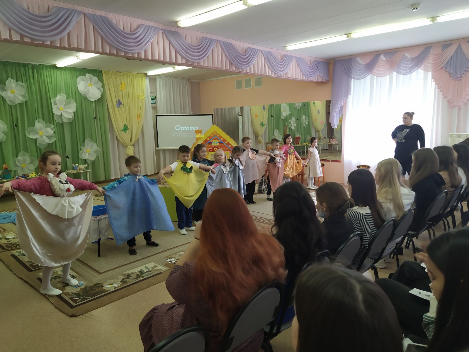 С целью расширения знаний студентов о театральной деятельности в детском саду и совершенствования практических навыков, необходимых в работе с детьми по данному направлению на базе нашего сада 28 марта организован семинар-практикум для студентов НГПУ "Театрализованная деятельность в детском саду". Студенты 1,4 курсов имели возможность посмотреть театральные постановки во всех возрастных группах "Тараканище", "Кошкин дом", "Курочка Ряба", "Лиса и мышонок", "Глупый мышонок", "Заюшкина избушка", сценку "Старушки на завалинке". Студенты имели возможность на практике увидеть как работают педагоги в данном направлении, набраться педагогического опыта.