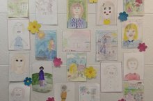 В школе оформили выставку рисунков посвященных "Дню матери", мама глазами ребенка.