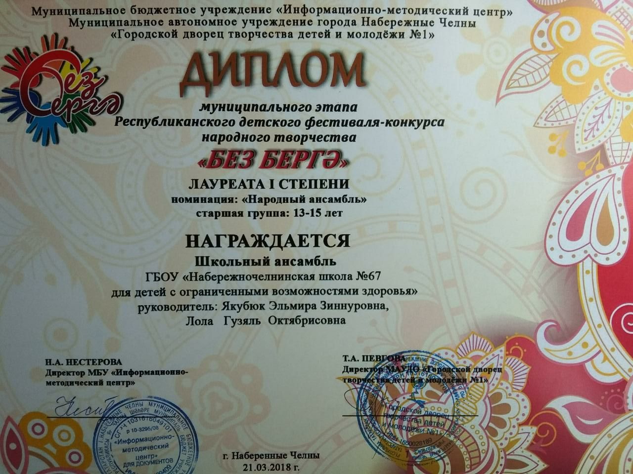 21 марта 2018 года школьный ансамбль ГБОУ "Набережночелнинская школа №67" приняла участие в муниципальном этапе республиканского фестиваля "Без бергә"