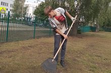 Обучающиеся трудовой бригады помогают убирать территорию школы от наносного мусора.