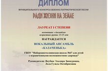 17.03.2022 г. вокальный ансамбль " Казаченька" ГБОУ "Набережночелнинская школа № 67" стал лауреатом 1 степени за участие в конкурсе военно- патриотической песни " Ради жизни на Земле"