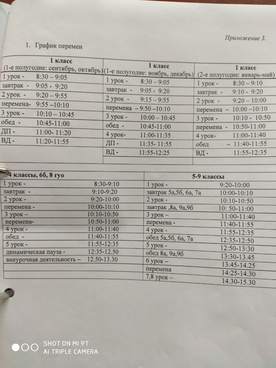 - Приложение №3 «График перемен, составленному с целью минимизации контактов обучающихся (в том числе сокращении их количества) во время проведения термометрии приёма пищи в столовой»,