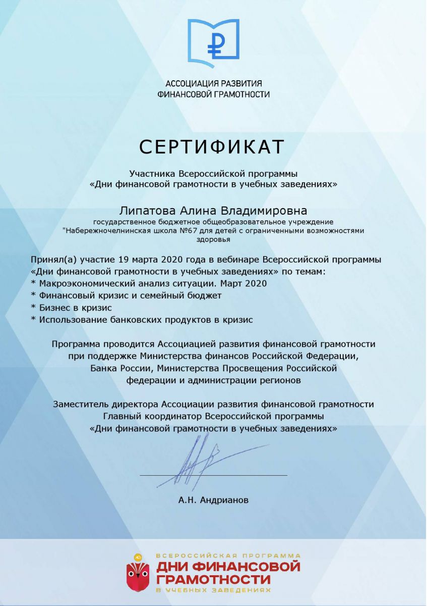 Всероссийская программа "Дни финансовой грамотности в учебных заведениях"
