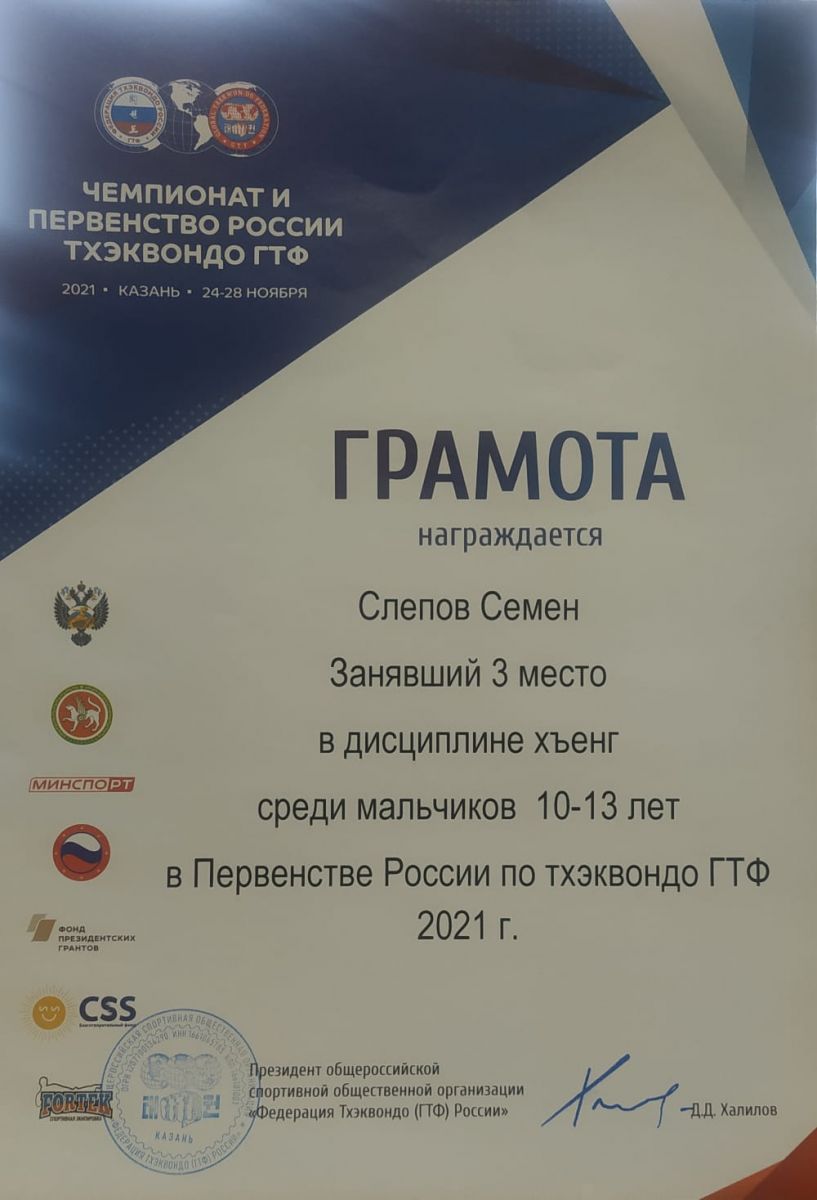 Опубликовано: 26.11.2021Обучающийся ГБОУ "Набережночелнинская школа № 67" Слепов Семен занял 3 место в дисциплине хъенг среди мальчиков 10 -13 лет в Первенстве России по тэквондо ГТФ 2021 г.