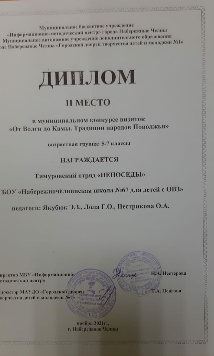 Опубликовано: 16.12.202116.12.2021 года тимуровский отряд " Непоседы " получил Диплом 2 степени за участие в муниципальном конкурсе визиток " От Волги до Камы. Традиции народов Поволжья". Поздравляем победителей!