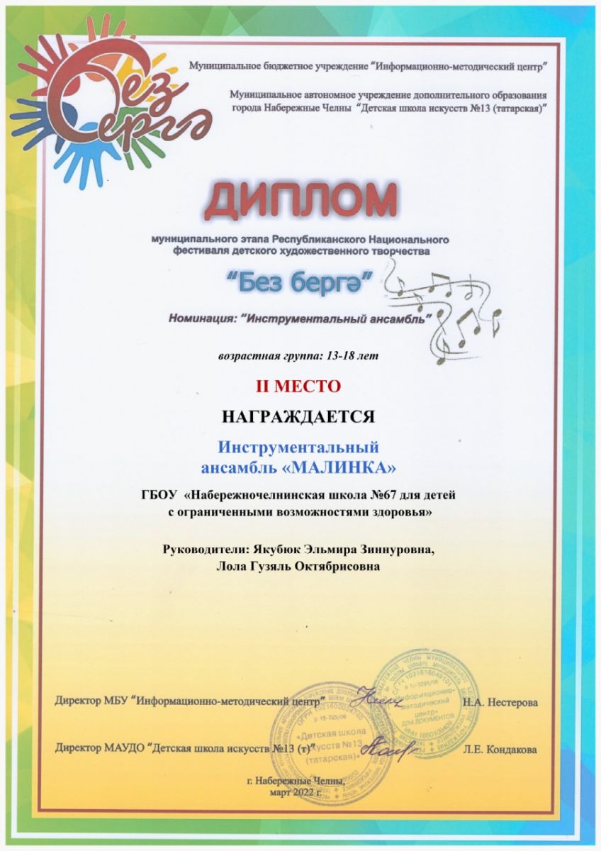 Опубликовано: 15.04.202214.04.2022 года инструментальный ансамбль " Малинка" был удостоен диплома 3 степени за участие в муниципальном этапе Республиканского Национального фестиваля детского художественного творчества " Без бергэ" в номинации " Инструментальный ансамбль ". Поздравляем победителей!