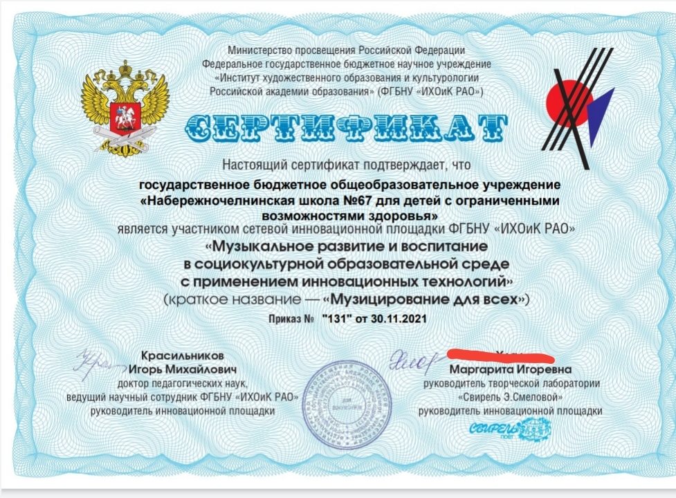 Опубликовано: 15.11.2021ГБОУ "Набережночелнинская школа №67" является участником Федеральная сетевая инновационная площадка "Музыцирование для всех" Института художественного образования и культурологии Российской академии образования.