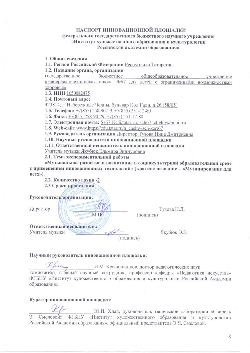 Опубликовано: 17.02.2022ГБОУ "Набережночелнинская школа №67" получила паспорт Федеральной сетевой инновационной площадки "Музыцирование для всех"