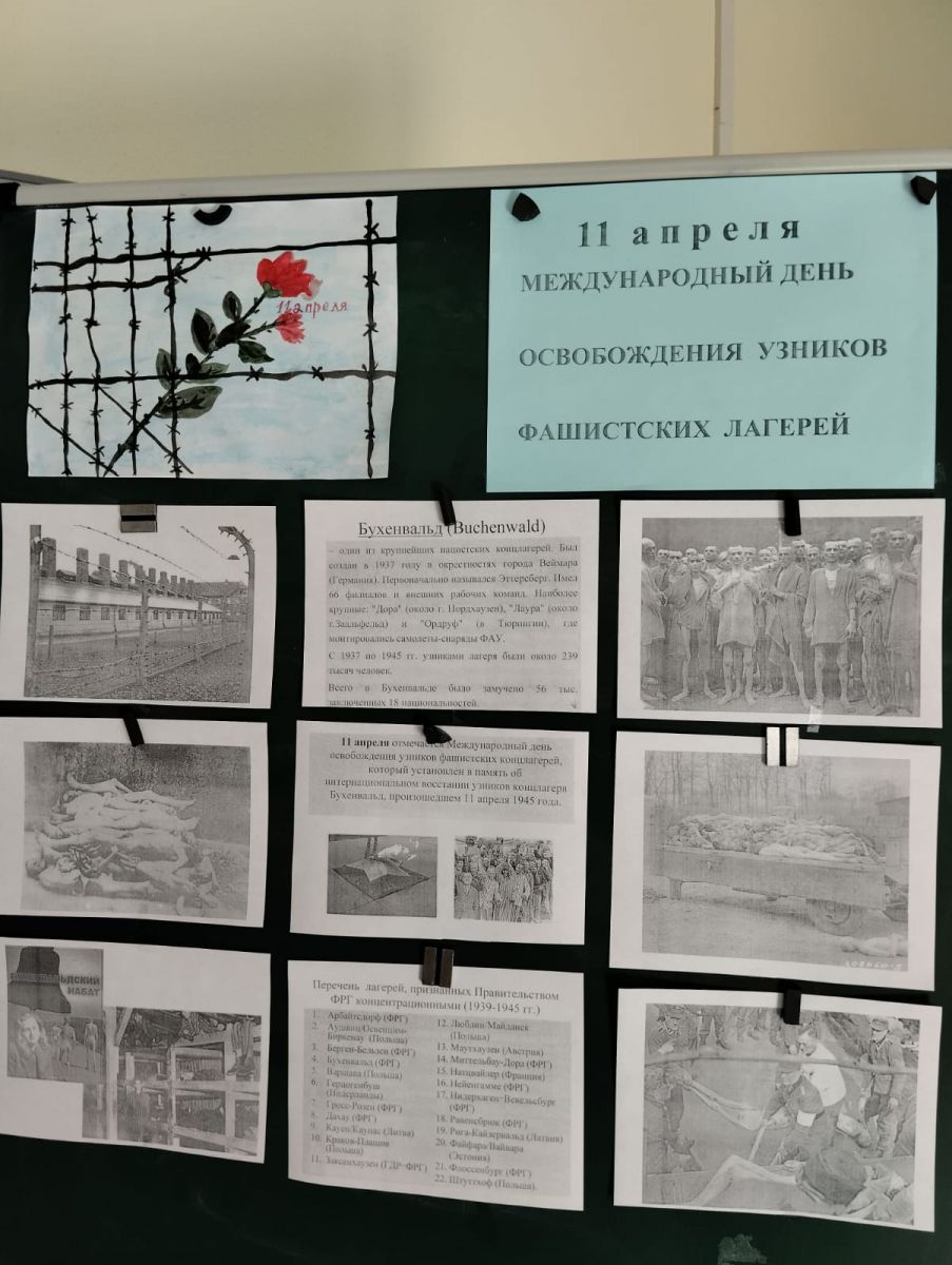 Опубликовано: 10.04.2023Во всем мире сегодня вспоминают тех, кто стал жертвами нацизма. 11 апреля — Международный день освобождения узников фашистских концлагерей. Он установлен в память о восстании в Бухенвальде — одной из крупнейших и самых жестоких фабрик смерти. В школьной библиотеке оформлен стенд, посвященный Международному дню освобождения узников фашистских концлагерей.