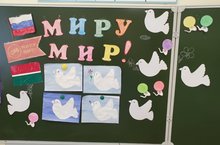 Учащиеся 5в клласса приняли участие в Городской акции "Да будет мир!". В рамках данной акции организовали выставку рисунков, провели классный час. Мир начинается с каждого из нас, с доброго отношения к родным и близким, уважения к старшим, терпимости к посторонним людям и доброты вокруг. Каждый день мы учим детей жить дружно, не ругаться, дарить друг другу тепло, помогать и заботиться друг о друге.