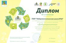 Наша школа награждена дипломом III степени за победу в городской экологической акции по сбору пластиковых крышек "Доброкрышечки" в пользу благотоворительного фонда "В помощь бездомным животным" в рамках проекта "Экоактивы".