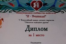 Ученица школы награждена дипломом за 1 место в V Всероссийском конкурсе детского творчества "Обитатели подводного мира". Педагог: Сингатуллина А.И.