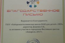 ГБОУ "Набережночелнинская школа № 68 для детей с ОВЗ" награждено благодарственным письмом за активное участие в городском фестивале цветов "Акварель-2017"