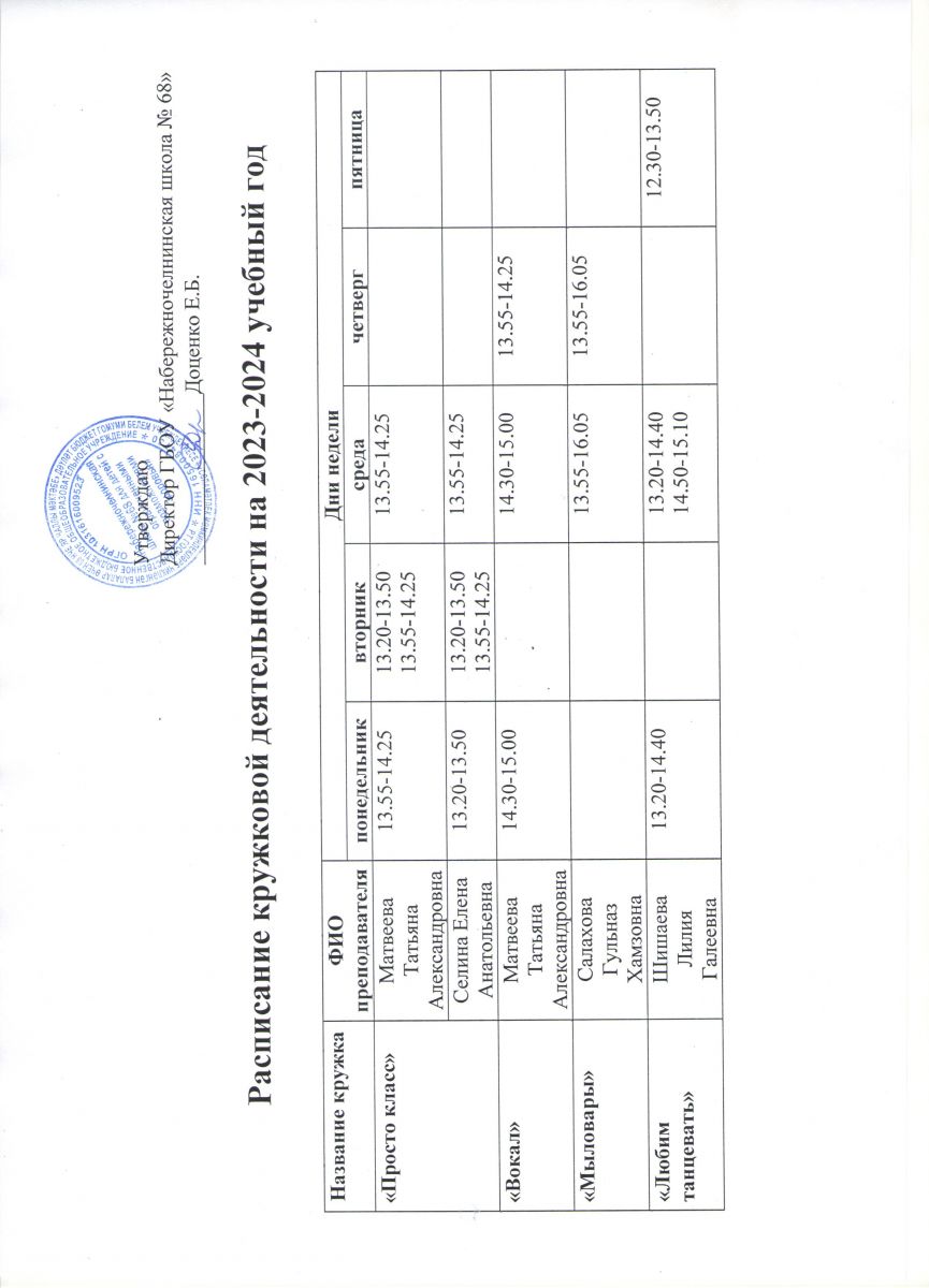 Расписание занятий дополнительного образования на 2023-2024 учебный год