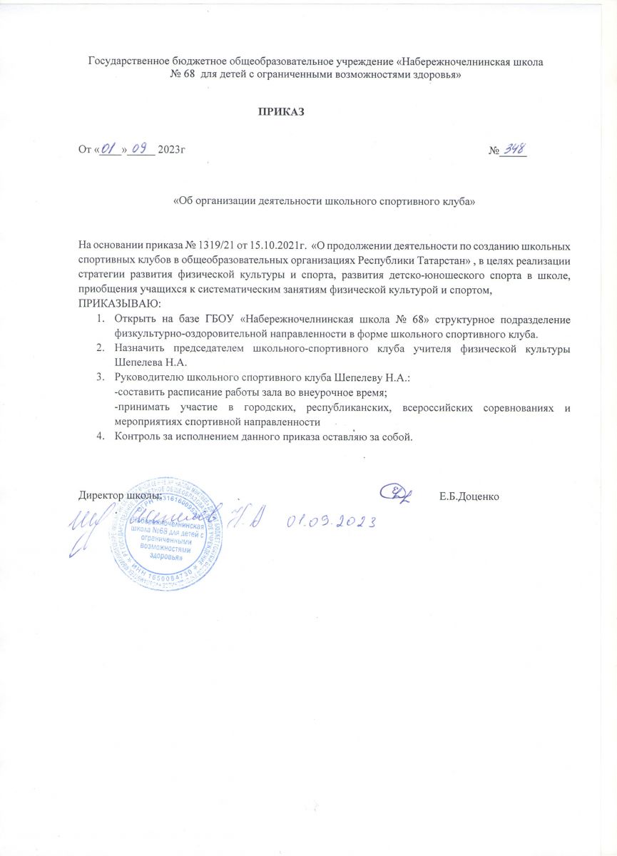 Приказ о создании школьного спортивного клуба