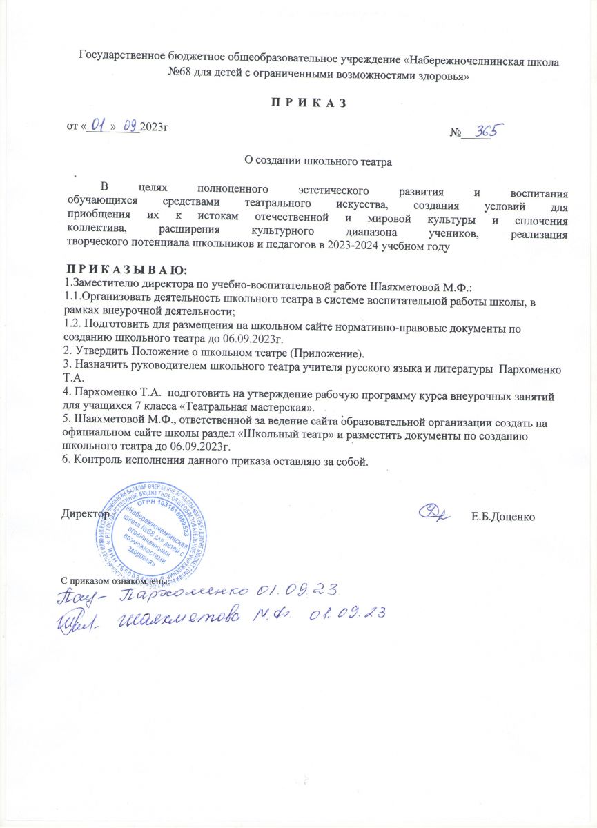 Приказ о создании школьного театра