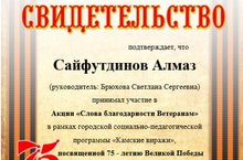 Ученик 5В класса Сайфутдинов А. принял участие в городской социально-педагогической программе «Камские виражи», акция «Слова благодарности Ветеранам».