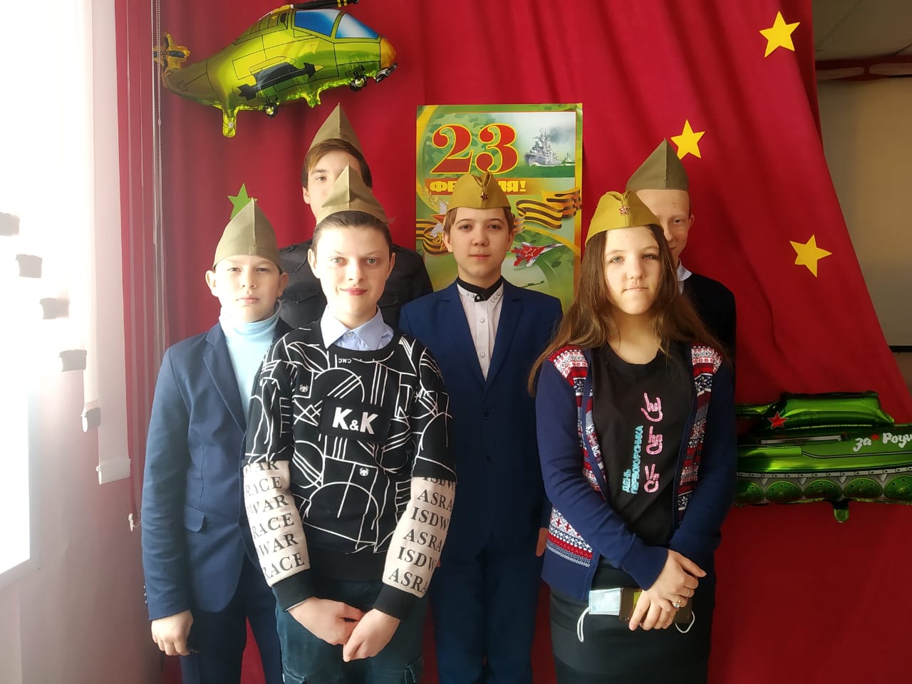 Тимуровский отряд "Дружба" красочно оформили актовый зал для фотосссесии и праздника, посвященного Дню Защитника Отечества.
